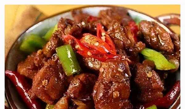 4、倒入腌好的鸭肉翻炒至熟。倒入老抽,边炒边上色。将啤酒倒入瓶中,盖上鸭肉,中火慢炖。慢慢收汁,加入青椒翻炒。