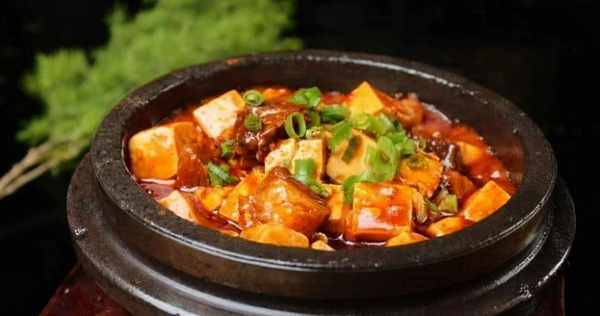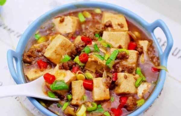 4.下菜前,先将豆腐(连汤)舀入干净的锅中,加入牛胸肉和蒜苗略煮,加入鸡精、味精淋藤椒油和香油,放入锅中,用铁锅煮熟即成。