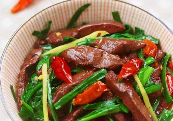 4.大火快速翻炒,数到五秒或用眼睛看。当猪肝表面刚开始变白时,有的还没有变白,颜色略带粉红色,立即捞出;