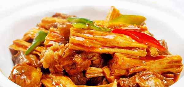 2.锅内倒入油,加入姜蒜爆香,然后加入八角和牛腩翻炒片刻,最后加入冰糖和酱油,翻炒约1分钟后加入适量清水用小火煮30分钟。待水快积聚时,放入豆腐条,翻炒约2分钟,然后加入盐和味精,在锅中炒匀即可食用。