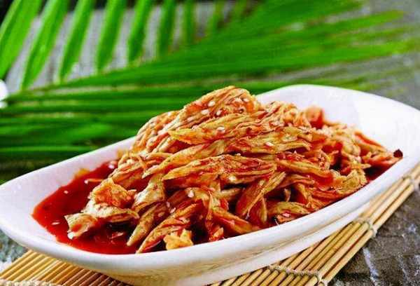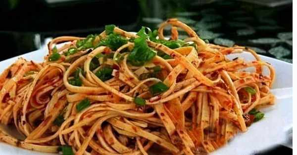 3、锅内倒入油,将蒜末和干辣椒炒香,加入刚炸好的豆腐丝,翻炒几下,撒上熟芝麻,装盘。