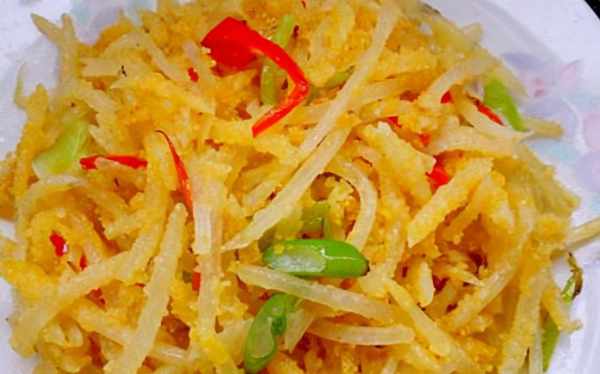 3、炒锅里的油烧到70%时,放入土豆片再炒。当金黄色时,取出并沥干油,放在盘子里。吃前撒上胡椒粉和白糖。