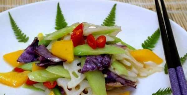 配料表:紫甘蓝、藕片、芥蓝、黄椒、小米椒、油、盐、鲜菜、芡实粉