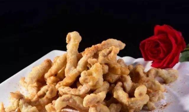 7、将炸好的肉条放入碗中,撒上盐和药明粉。将锅的侧面倒过来,用盐和姚覆盖肉条。