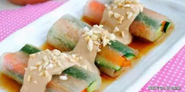 11、将稀释好的花生酱淋在冬瓜卷上,撒上花生碎即可食用。