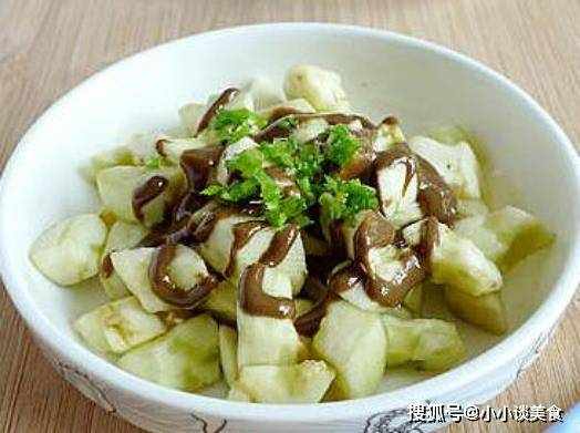 材料:茄子130克,芝麻酱,香菜,盐,苹果醋,香油
