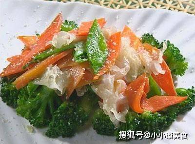 1。银耳焯水,捞出装盘,撒少许糖拌匀,西兰花、荷兰豆焯水待用;