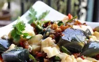 实践:1.锅中烧开水,加入少许精盐搅拌均匀,将嫩豆腐浸入热盐水中,切成小块;皮蛋去皮洗净,切成小块;香菜洗净切碎。