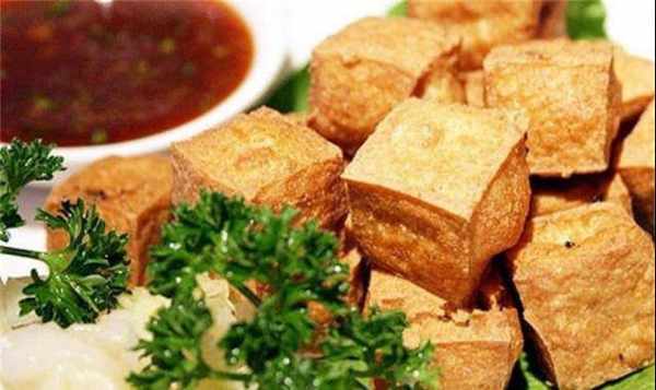 4、将炸好的豆腐放在盘子里,撒上花生米,拌或蘸上糖醋汁即可食用。