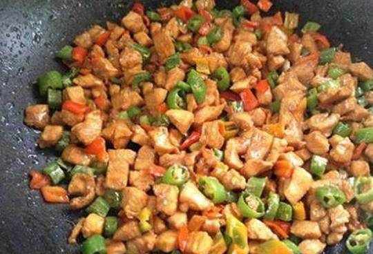 热锅热油,倒入鸡肉翻炒变色,再倒入其他配菜还有适量的调料,翻炒均匀就可以啦。
