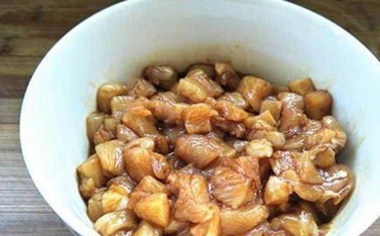 鸡肉有益五脏,补虚损,补虚健胃。首先把鸡胸肉切小块,腌制好,其余食材切粒。