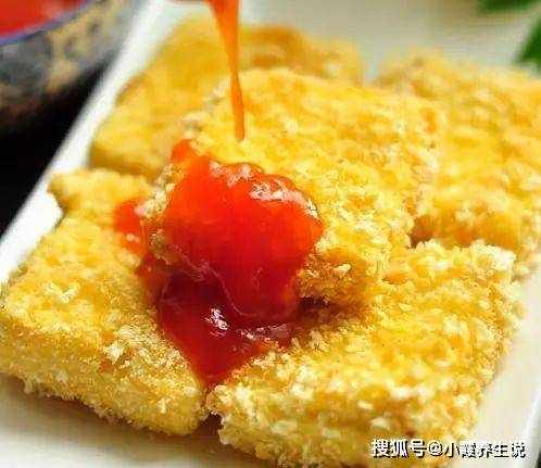 材料:豆腐半块、油适量、盐适量、番茄酱2汤匙、白糖1汤匙、九度米醋1汤匙、淀粉水少许、面包糠适量、面粉适量、鸡蛋1个