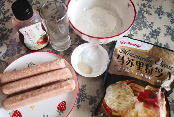 食材:中筋面粉120克,温水66克,酵母1.5克,糖3克,盐1克,香肠1根,马苏里拉芝士150克,洋葱少许,番茄酱适量