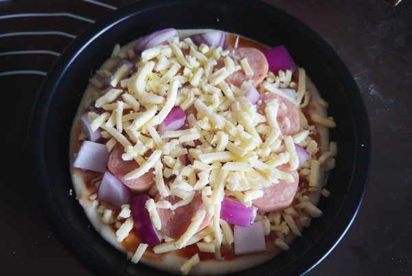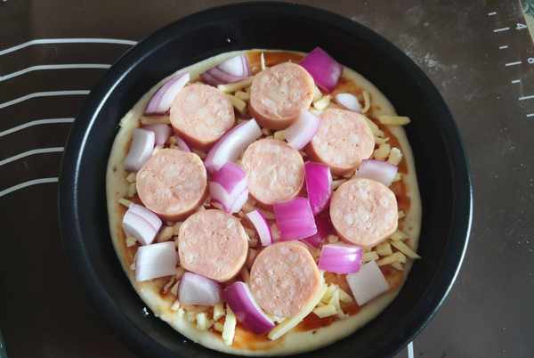 5. 香肠切成圆片,洋葱切成丁,在披萨面饼上先撒一层马苏里拉芝士,再摆上香肠片,撒上洋葱丁,