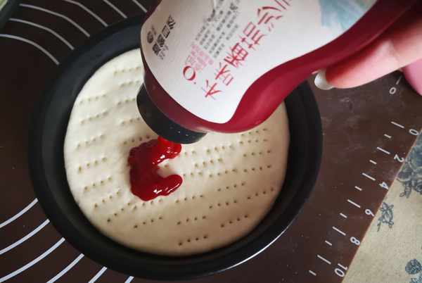 4. 根据披萨盘大小来弄面团,正常这是一张八寸披萨的用量,我的是小的披萨盘,所以把面团分成两份,擀成圆盘状,模具刷油,把面饼放进去弄平,再用叉子扎孔,防止面饼烤的过程中会鼓起来,再挤上适量的番茄酱,