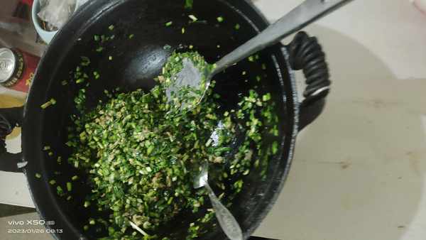 第二步,把韭菜切碎,鸡蛋煎熟,打成鸡蛋碎,虾仁剁碎放在,拌菜盆中加入,食用盐,耗油,料油,香油搅拌均匀就可以包水饺了