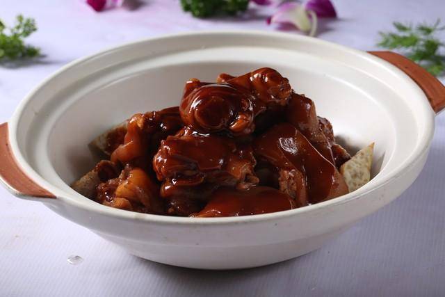收汁;将猪蹄倒入炒锅,大火收汁,汤汁浓稠即可出锅