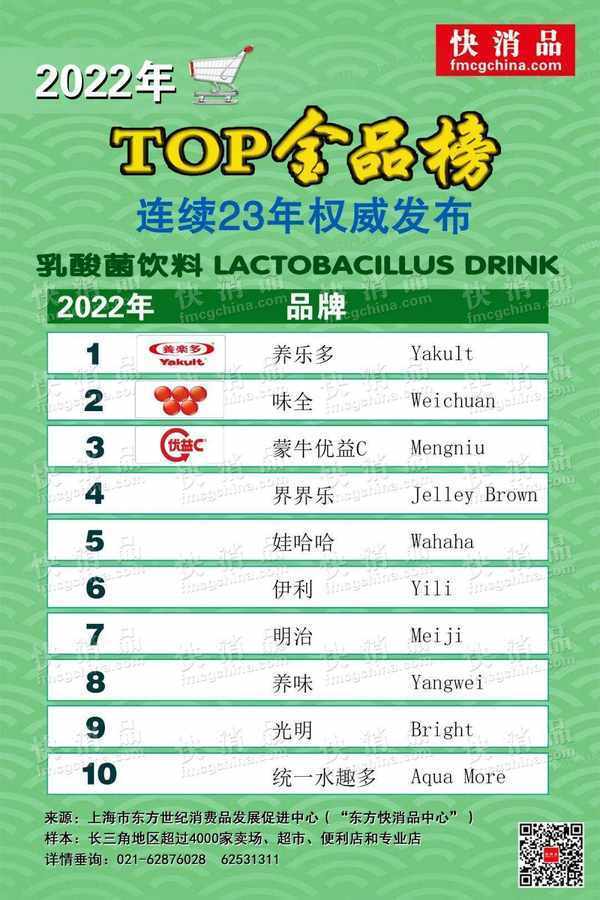 2022年线下TOP金品榜——乳酸菌饮料、低度微醺”,其中养乐多、贝瑞甜心分别夺得品类冠军,味全、蒙牛优益C、俏雅、梅见等品牌登榜。