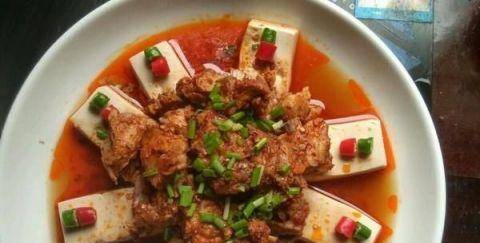 3.将豆腐和排骨摆盘,放入烤箱。水开后,用大火蒸10分钟左右。将其取出并撒上切碎的葱即可完成。