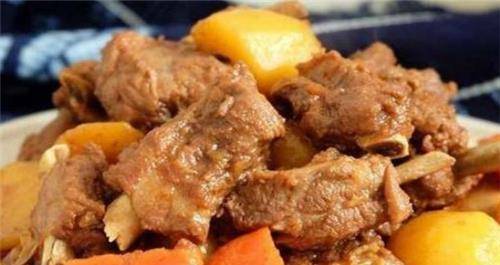 6.加入切碎的胡萝卜和土豆。加入老抽、生抽、冰糖慢炖;7、土豆、胡萝卜煮熟后转大火收汁;出锅后撒上葱。