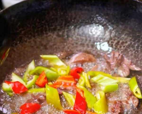 起锅烧油,油温升到5成熟时,下入腰花,过油定型后,将准备好的青红椒放入一起过油,然后捞出放置一边控油。