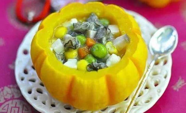 8.将海蛎汤放入蒸好的南瓜杯中。
