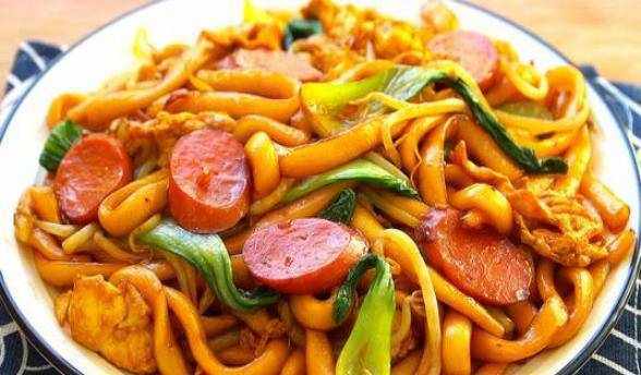材料:土豆粉、火腿肠、蔬菜、鸡蛋、辣椒碎、油、老抽、生抽、醋