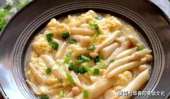 原料:白玉菇300克、鸡蛋2个、皮50克、葱1条