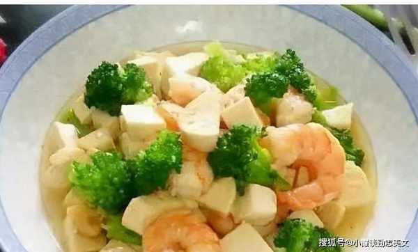 材料:软豆腐、西兰花、虾仁、盐、料酒、淀粉、食油、葱、蒜、蚝油。