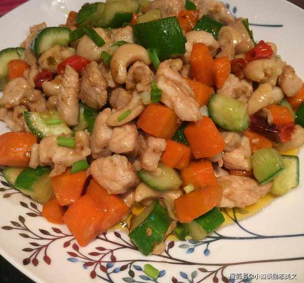 配料表:鸡肉、腰果、黄瓜碎、胡萝卜碎、葱花、姜末、料酒、酱油、食盐、胡椒粉、八角红椒、干红椒、鸡精、香油、水淀粉;