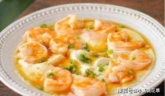 材料:嫩豆腐、鲜虾10只、荔枝6-8颗、鸡蛋2个、葱花、盐、料酒、香油、生菜干。