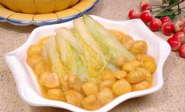 做法:1、将白菜芯用清水浸泡5分钟,然后冲洗干净;