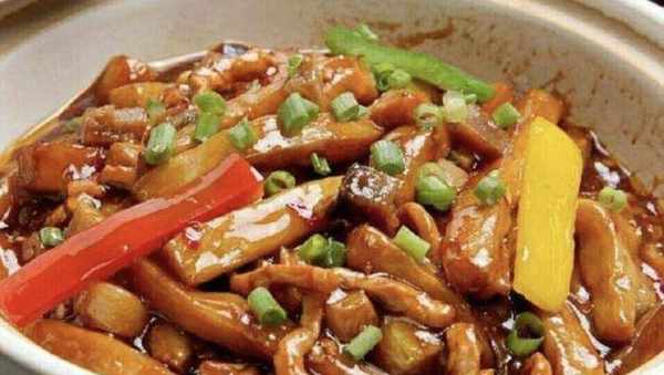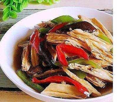 原料:排骨(五花肉)400克,青椒、红椒、黄椒各100克,豆腐干各适量,豆瓣酱25克,甜面酱10克,酱油10克,料酒5克,盐3克,味精2克,植物油20克,大蒜适量。