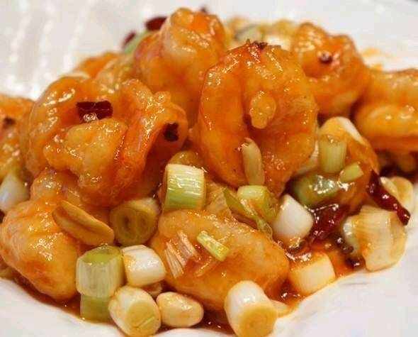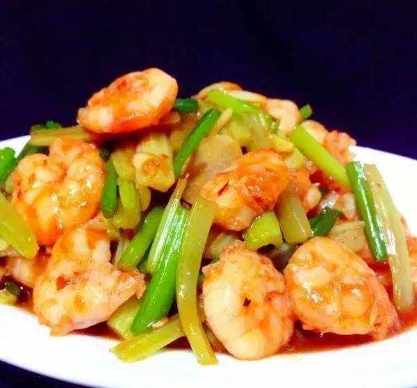 6、再次起净锅,加入底油,加入泡椒炒红油,加入姜末和蒜末,炒香,加入鱼露,加少量水翻炒,加入虾仁和青菜洋葱炒均匀