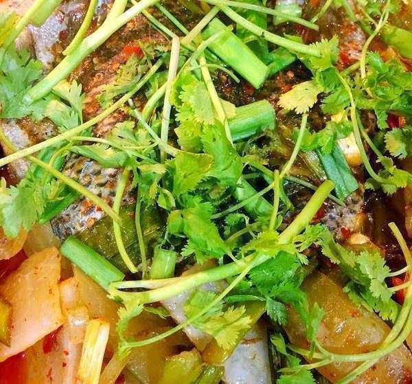 3.锅里放少许油,把花椒丸炸熟,然后和花椒丸一起撒在鱼身上,最后撒上香菜和白芝麻就可以吃了;