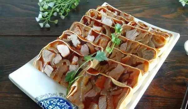 1、肥瘦猪肉连皮刮洗干净,放入汤锅中煮10分钟,半熟时捞出,放凉后切成5厘米长、4厘米宽的片,和0.2厘米厚。