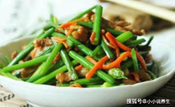 3、锅里油烧热,放入瘦肉炒至变色,加一勺酱油上色,然后放入干净的锅中,油热,放入韭花炒十分钟左右秒,加入胡萝卜和瘦肉混合约十秒!一切都是火