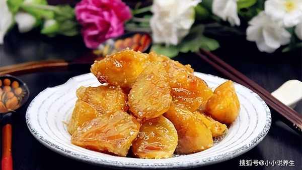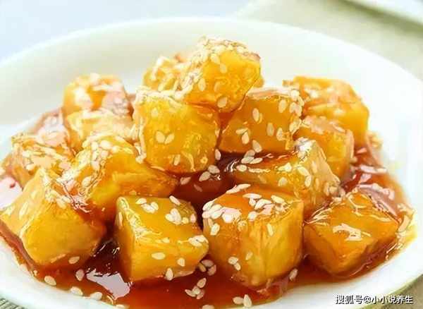 4、加入炸好的红薯,摇动锅,让汁液完全覆盖红薯,关火,装盘,撒上芝麻。