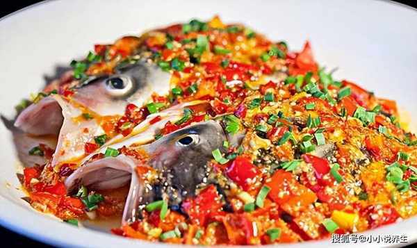 6.将鱼头放在上面,放入锅中。将两根筷子放在锅底下,这样鱼头透气性更好,熟得更快。盖上锅盖,用大火煮8分钟。(因为鱼头大,肉厚,一般鱼头蒸5分钟即可)7、此时,另取一锅,倒入适量清油,放入蒜末、青红辣椒、小米椒、长青椒。
