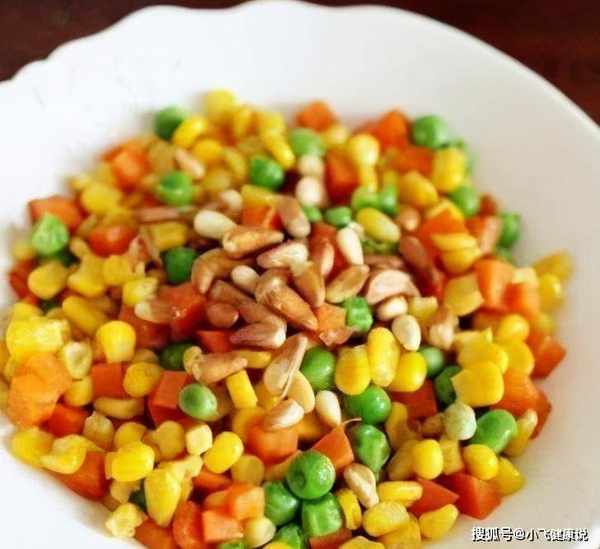 冷冻青豆适量;冷冻甜玉米粒包装;半个胡萝卜;2汤匙松子;1/2茶匙盐