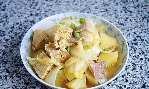 材料白菜1个,土豆半个,小豆腐10块,猪肉适量,油适量,盐适量,五香粉适量,葱适量,姜适量,生抽适量,适量料酒和蘑菇粉