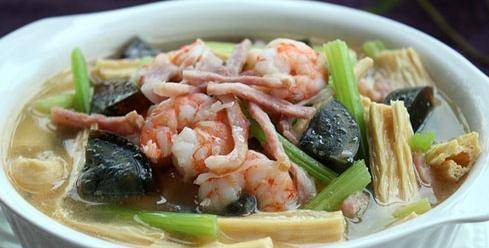 原料:腐竹、鲜虾、皮蛋、肉、芹菜、姜、葱、蒜、盐、白酒、玉米、胡椒粉、鸡精、料酒。