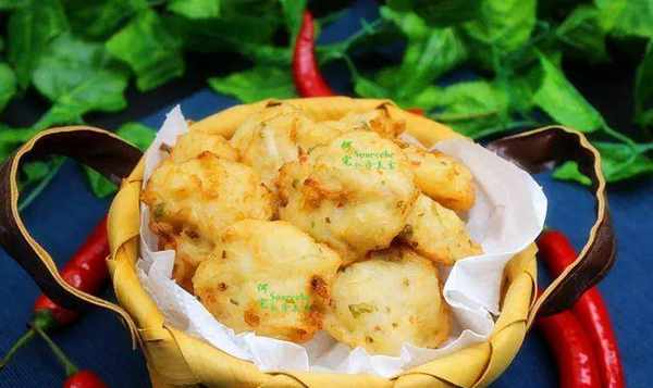 4、锅内倒入适量食用油。油的温度约为160度。将拌匀的萝卜奶放入勺子中,倒入油锅中,在油锅中会变成一个个的。油炸