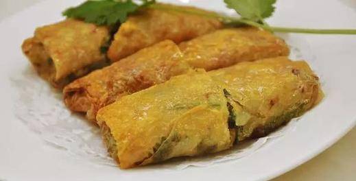 6、菜皮豆腐皮卷成卷,裹上韭菜末,蒸5分钟;
