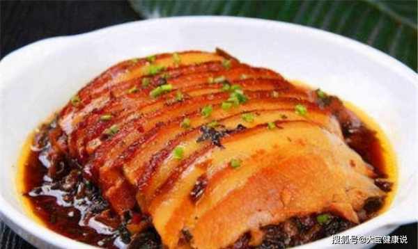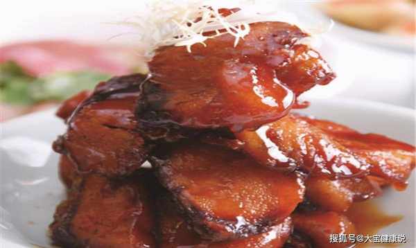 2.锅置旺火,加入植物油加热至80%热。将五花肉放入油中炸至火红,捞出切成厚片;