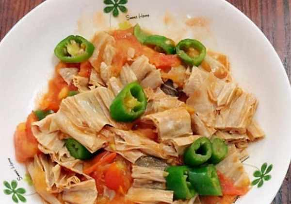 材料青椒1个、番茄1个、腐竹1条、油15克、盐1.5克、酱油5克