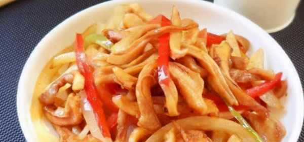 5、锅中油再次烧热,放入切好的牛肚丝翻炒,加少许料酒。