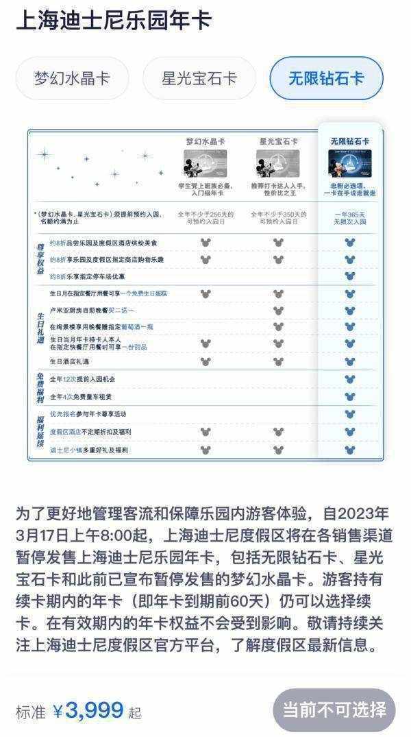 上海迪士尼乐园宣布:为了更好地管理客流和保障乐园内游客体验,自2023年3月17日上午8:00起,上海迪士尼度假区将在各销售渠道暂停发售上海迪士尼乐园年卡,包括无限钻石卡、星光宝石卡和此前已宣布暂停发售的梦幻水晶卡。游客持有续卡期内的年卡(即年卡到期前60天)仍可以选择续卡。在有效期内的年卡权益不会受到影响。