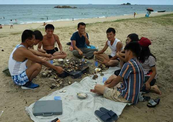 在国外的饮食条件是非常不错的,早餐一般就是自助餐形式,能吃到粥、泡菜、面包、饺子、馒头、青菜、炒面、玉米等等,吃饱是没有问题的,午餐和晚餐一顿比一顿丰盛,顿顿有荤有素,比如:炒菜、冷面、拌饭、泡菜、火锅、烤肉、烤鸭、铜碗饭等等,顿顿能喝到大同江啤酒,导游告诉大家,国外是没有农药和化肥的,这些肉和蔬菜都是纯天然绿色食品,可以放心的吃,听导游这么说,大家索性就放开了手脚,顿顿实行光盘行动!