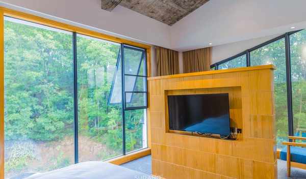 每个房间的窗户都是落地大窗,也是一幅大自然的山水画:连绵起伏的群山,掩映在森林中的宁静村庄,窗外可以看到水镜湖碧波荡漾。